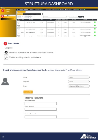 STRUTTURA DASHBOARD 1 2 1 Area Utente Qui puoi: Visualizzare/modificare le impostazioni dell’account Effetturare il logout dalla piattaforma Dopo il primo accesso modificare la password dalla sezione “impostazioni” nell’Area Utente. 3